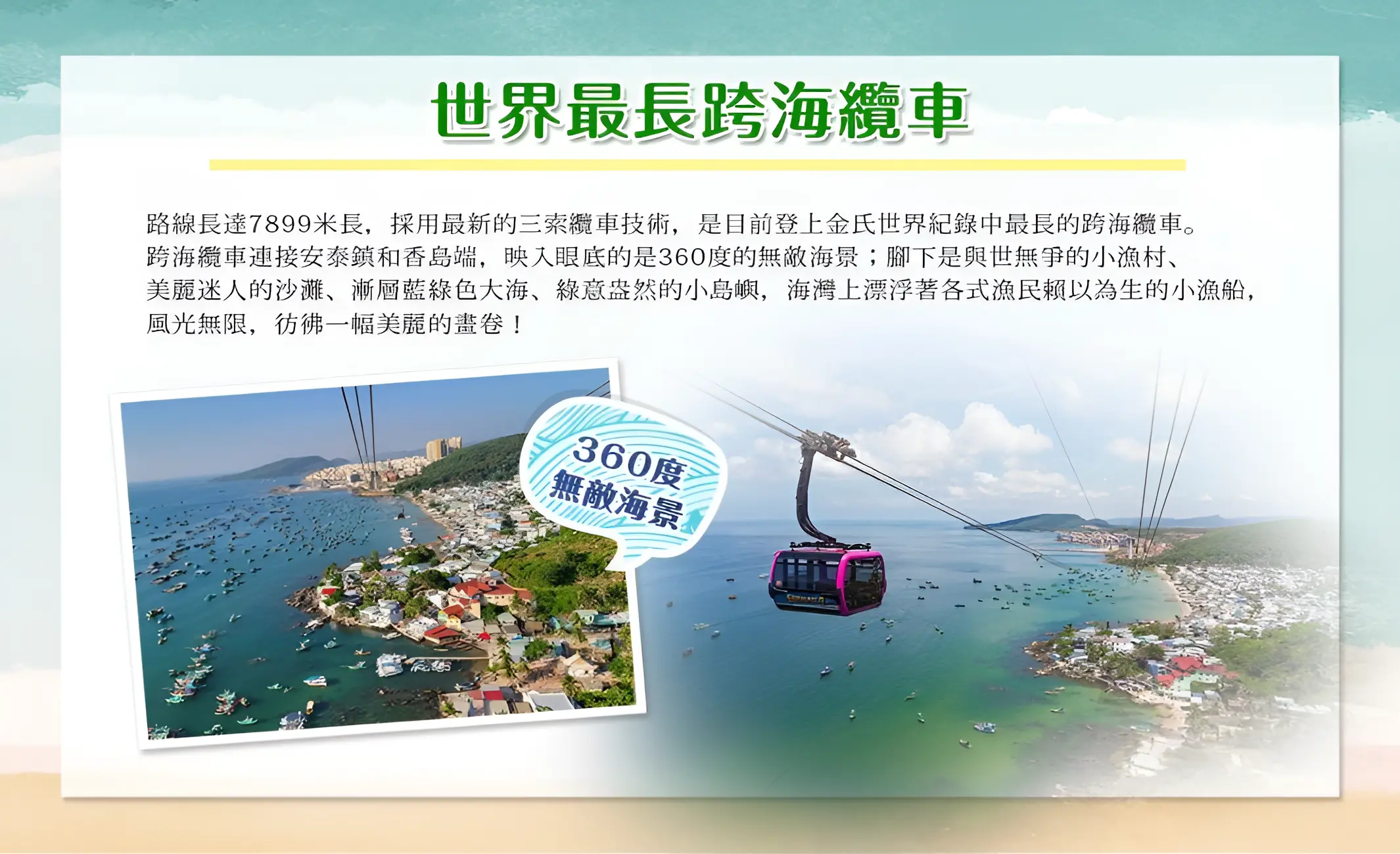 【世界上最長的跨海纜車~360度無敵海景】2018年2月,富國島~陽光世界香島自然公園 (Sun World Hon Thom Nature Park)落成開放,自然公園設施包含跨海纜車、遊樂園和 水上樂園構成。跨海纜車的路線長達7899米長,共有69節車廂,每節車廂最多可載30 人,最高速度為每秒8.5米,並採用最新的三索纜車技術,是目前登上金氏世界紀錄中最長 的跨海纜車。跨海纜車連接安泰鎮和香島端,香島這座與世隔絕的小島擁有綠色的植被和未 破壞的自然生態美景。從世界上最長的纜車看著美麗的一切,映入眼底的是360度的無敵海 景;腳下是與世無爭的小漁村、美麗迷人的沙灘、綠意盎然的小島嶼,海灣上漂浮著各式漁 民賴以為生的小漁船風光無限,彷彿一幅美麗的畫卷!不管是早晨還是黃昏,纜車上的視野 都是欣賞南部小島最美的角度!