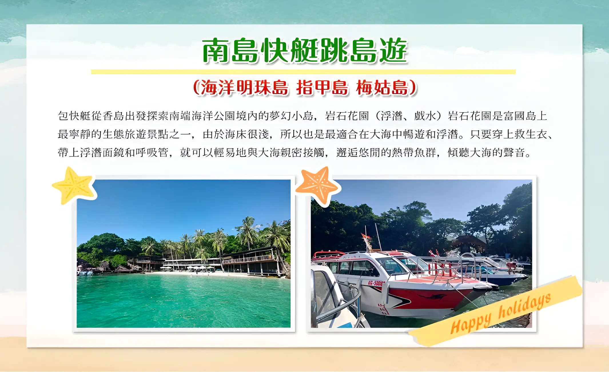 【Hon Mong Tay 南指甲島】這是一個美麗又充滿魅力,浪漫又荒涼島嶼,處處都有驚喜的 自然美景,有月亮形狀的原始海灘、細白的沙灘,藍綠色澄的海水,展現未經開發的狂野之 美。站在島上只聽到海浪輕柔拍打沙岸的聲音、樹木的低語,以及昆蟲動物的鳴叫…所有這些 都是自然的聲音,取代了城市的喧囂,宛如電影中無人島的景色,對於喜歡攝影的人,南指 甲島就是天堂,在島上記得來張浪漫的自拍,站在任何角落,背後的場景足以使畫面完美。 溫馨提示:本日請攜帶泳裝並著可防水拖鞋或洞洞鞋,並請做好防曬。