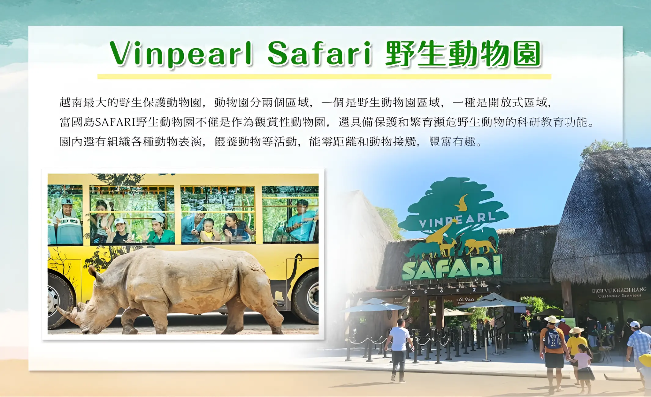 【Vinpearl Safari野生動物園】 SAFARI野生動物園是越南的野生保護動物園,位於富國島西北方。動物園分兩個區域,一個是野生動物園區域,一種是開放式區域,富國島SAFARI野生動物園不僅是作為觀賞性動物園,還具備保護和繁育瀕危野生動物的科研教育功能。園內還有組織各種動物表演,餵養動物等活動,能零距離和動物接觸,豐富有趣。富國島野生動物園是越南最大的野生保護動物園,動物園內生活著約3,000只動物,其中包括來自世界各地的150種珍稀動物。富國島野生動物園不僅僅是觀賞性動物園,還具備保護和繁育瀕危野生動物的科研教育功能,非常適合帶孩子前來,寓教於樂讓孩子瞭解如何保護動物。