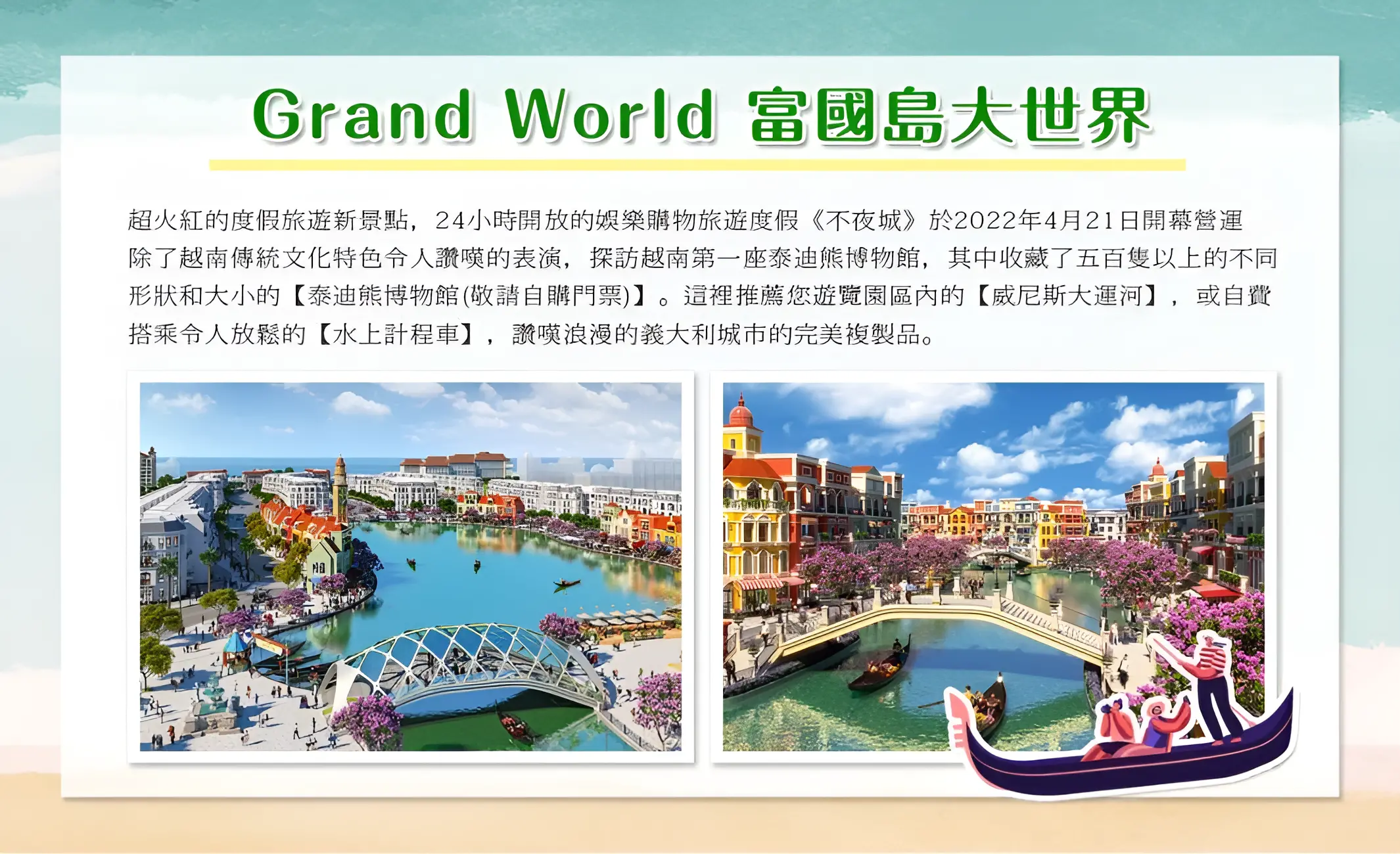 【Grand World Phú Quốc 富國島大世界購物商場】最近越南富國島超火紅的度假旅遊新景點是 越南首座全年全天候24小時開放的娛樂購物旅遊度假《不夜城》於2022年4月21日開幕營運 踏入純粹娛樂與豪華演出的富國大世界新開的旅遊和娛樂複合體觀賞具有越南傳統文化特色令人 讚嘆的表演,浸淫在越南的精隨中。驚嘆於由著名舞台導演Viet Tu精心編排的充滿活力的舞蹈 表演和精巧的音樂。