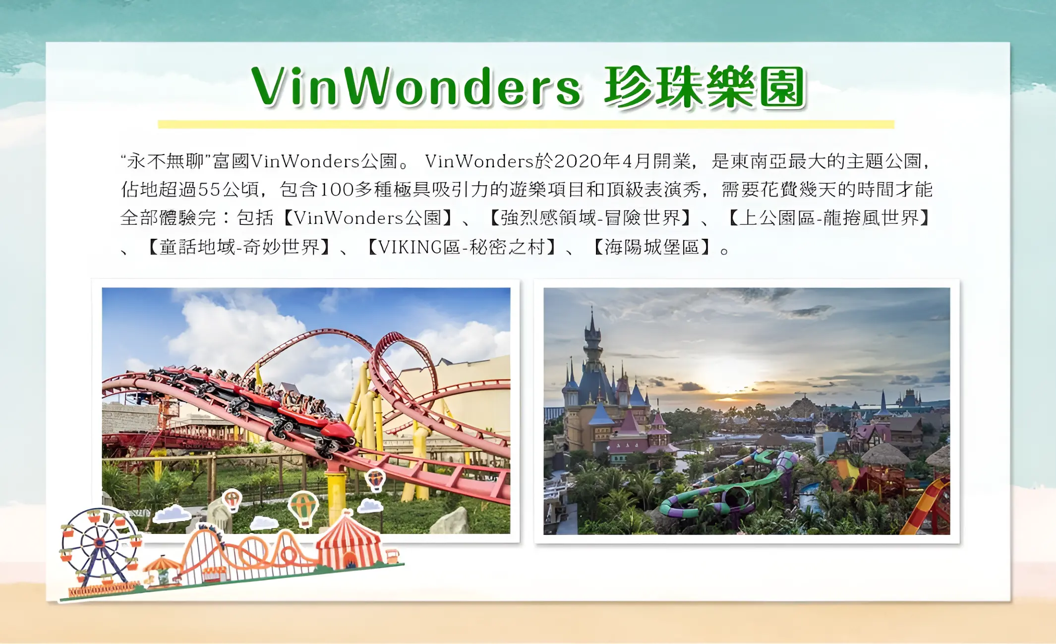 Vinpearl Safari 野生動物園 → 珍珠樂園VinWonders Phu Quoc 主題公園(主題遊樂設施,水上樂園,海洋水族館為一 體)→ 富國島國際賭場CASINO小試手氣