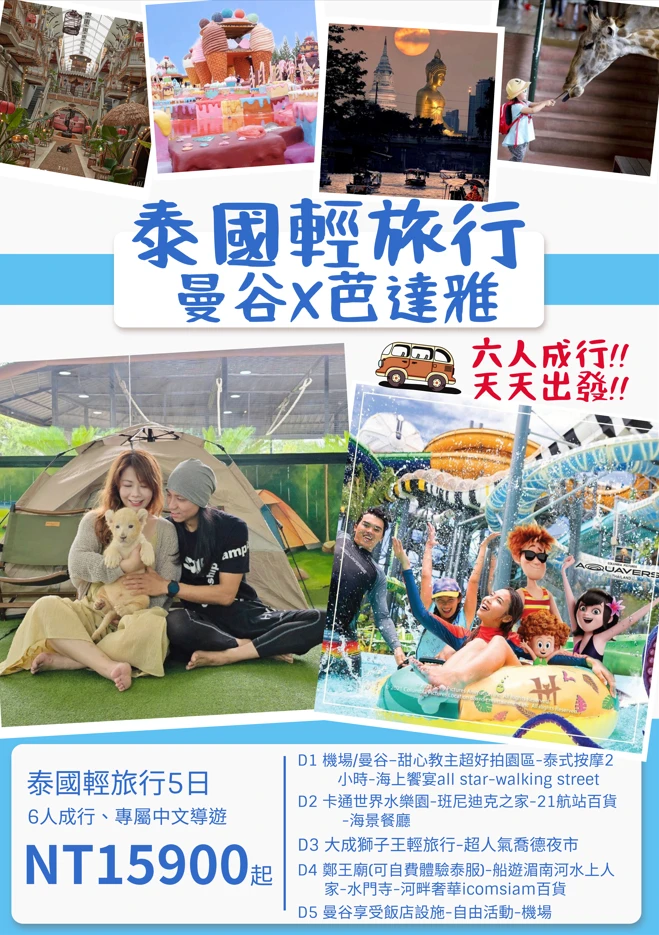 行程資訊旅遊國家泰國旅遊天數自由選價格歡迎洽詢我想報名行程特色 有興趣報名泰國客製化包車請幫我填寫上方我想報名表單!!!請填寫表單資料,我們將依照您的需求提供專屬行程與報價 ※填寫完成後並送出,我們業務專員將於 1-2 個工作天內(不含假日)與您聯繫。 參考行程方案泰秘境5日 ※行程供參考,行程皆可依照您的需求客製化做變更調整!邊玩邊買曼谷5日 ※行程供參考,行程皆可依照您的需求客製化做變更調整!去泰國當網美-北碧五日 ※行程供參考,行程皆可依照您的需求客製化做變更調整!泰國輕旅行 ※行程供參考,行程皆可依照您的需求客製化做變更調整!親子親親小旅行 ※行程供參考,行程皆可依照您的需求客製化做變更調整!