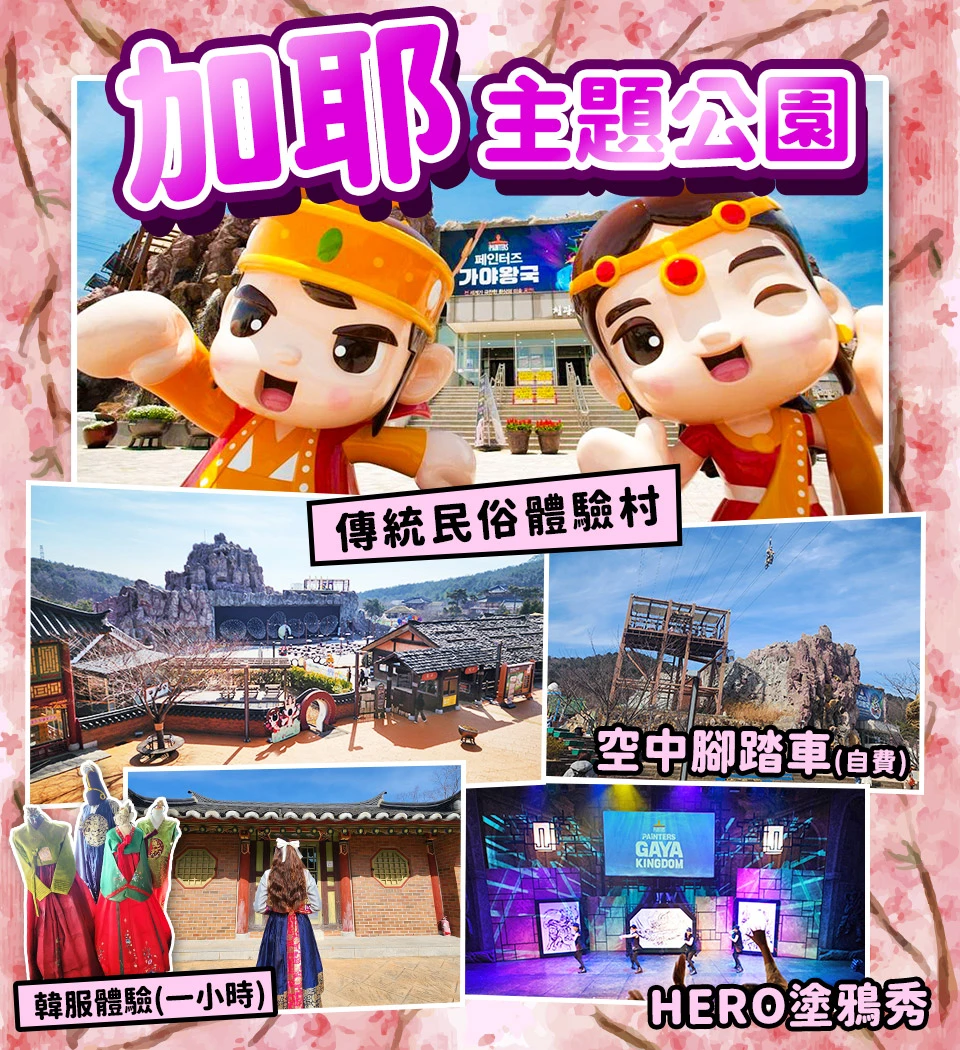 【加耶主題公園(賞櫻)】公元42年高句麗、百濟、新羅三國一起在韓半島留下擁有燦爛歷史的伽倻王國,園內占地17萬9千平方公尺包含四季花園、展示館、民俗體驗村、星光庭院、戶外3D影像燈光秀及塗鴉秀,以伽倻文化為主題公園,相傳伽倻國國王金首露王和一位印度阿踰陀國的公主許黃玉聯姻,金首露王愛戴皇后,建了很多美麗的宮殿。整個公園除了可以瞭解當時的歷史,在這裡可以通過遊戲、體驗活動、展覽等來看、來聽、來感受完整的古伽倻的燦爛歷史。