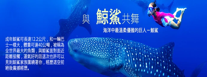 【鯨鯊保育區~歐斯陸與鯨鯊共舞一日遊(含午餐)】為了把握住親見鯨鯊,早上3-4點前將出發,前往位於宿霧市郊的鯨鯊保育區~歐斯陸(車程單趟約 3.5 小時),抵達後聆聽解說員進行鯨鯊生態和安全守則說明之後,隨即跳上賞鯨鯊船向大海駛去, 剛開始船在海灣中繞著圈子,鯨鯊保育員他們睜大眼睛觀看著海面的變化,從海浪波動的形式、海 中陰影、魚遊行徑來判斷是否鯨鯊的到來。一但聽見工作人員傳來:「鯨鯊!」的呼喊,他們隨即 關掉動力馬達,靜待著鯨鯊浮現的背鰭,然後終於一見海洋世界中最大型的魚類~鯨鯊,隨即戴上 蛙 鏡、咬緊呼吸管,噗通跳下水,準備與鯨鯊面對面近距離接觸(禁止觸摸或跟隨鯨鯊尾部&使用 水下 相機閃光燈)!此時在海面下只能聽見船夫的划槳聲跟鯨鯊的吐氣聲,如果運氣好的話這次也 許可以 見到鯨鯊家族圍繞著你,經歷這場空前絕後的與鯨鯊共舞的節目之後,相信許多人在短時間 之內, 都難以平撫興奮地情緒,自2002年華盛頓公約組織已將鯨鯊列為保育類動物,經過世界自 然動物保護協會WWF長期追蹤&研究,證實鯨鯊是卵胎生,但成年鯨鯊可長達12.2公尺,和一輛 巴士一樣大, 體重可達40公噸,被稱為全世界最大的魚類,並且能夠存活百年之久,性喜活動於 熱帶與亞熱帶海域,鯨鯊的蹤跡在非洲東西岸、加勒比海、菲律賓。今日的午餐安排於鯨鯊保護中 心享用菲式風味料理。