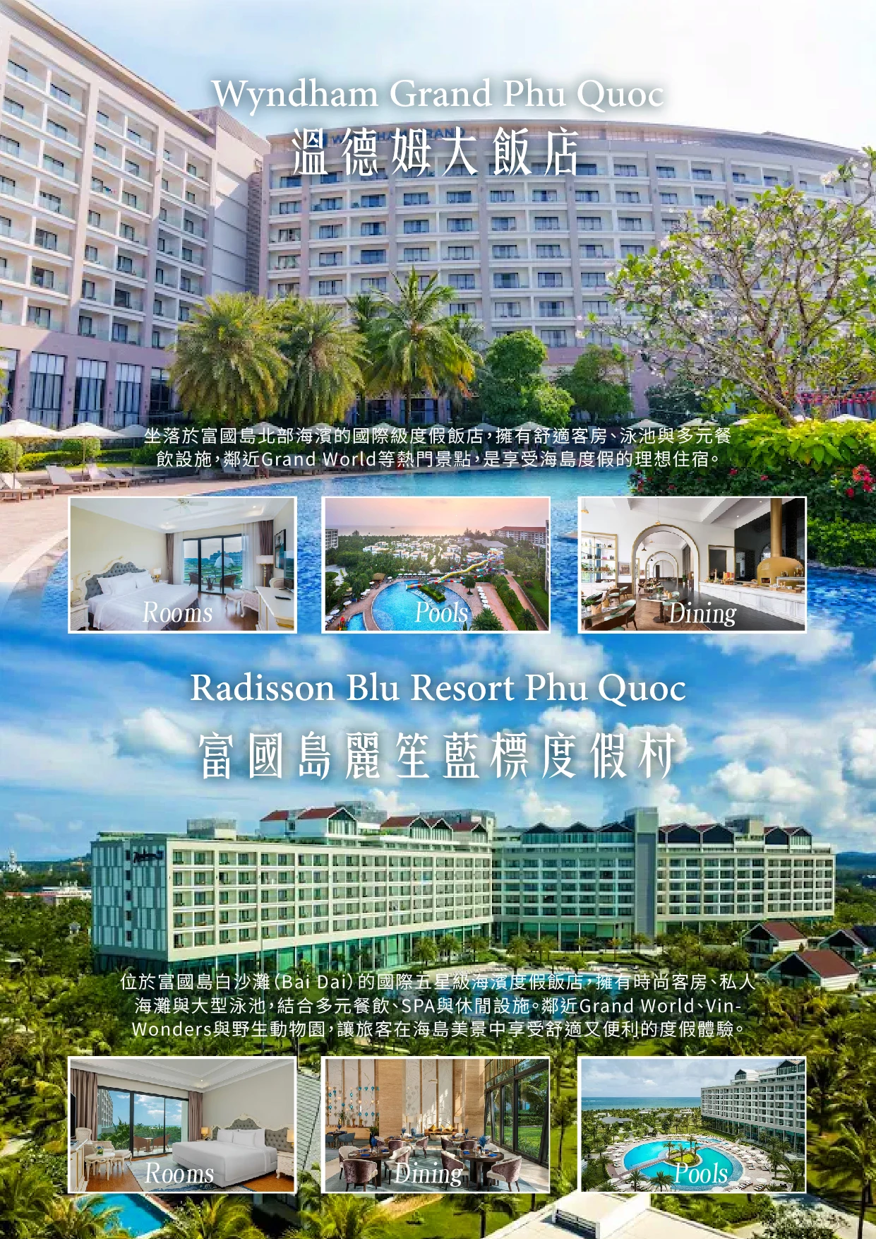 【太陽世界香島水上樂園】太陽世界Sun World 在越南發展觀光旅遊且獲得許多國際獎項,大受好評,繼中越巴拿山和峴港,越南最北端沙霸,北越下龍灣到2018 最新開幕的越南最南端的Sun World HonThom Nature Park 富國島太陽世界自然公園。目前共計有六大娛樂主題樂園系列。親子兒童互動區,藏著各式親水機關,讓您與小孩享受親子時光。金剛大水桶的淋漓洗禮更是不能錯過的清涼行程,天天都是潑水節,讓你全身濕濕樂。漂漂流河道,是情侶最愛明星設施,猶如戀愛巴士水上版,進入這條270 公尺的天然浪漫流域,沿路充滿鳥語花香與水瀑布驚奇,用最舒服的姿勢順留而下,帶您體驗自由自在水上漂。另有各式各樣刺激高空快速滑水道,不管是從密閉黑洞瞬間垂直下墜,或是階梯式噴射彈出、在彎曲滑道團團轉,上衝下洗的驚悚體驗,要你變成高分貝尖叫的自由落體。到此樂園一定要體驗最刺激『木造雲霄飛車』帶給您爬昇、滑落、急轉、迴圈的快感。除了令人驚喜的跨海纜車外,園區內還有附設有休閒餐廳、咖啡廳、遊樂園、水上樂園,園區也聘請來自各國的樂團、演奏家、街頭藝人不定時的在每個角落展開藝術表演,也讓你的假期時光更精彩,來富國島的你千萬不要錯過。