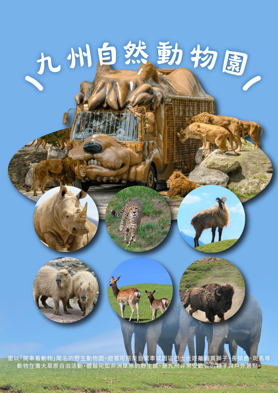 【九州自然動物園(含野生叢林巴士)】是日本規模最大的放養型野生動物園之一,以「貼近自然、近距離觀察」為最大特色。園區採開放式設計,模擬動物原生棲息環境,讓獅子、老虎、長頸鹿、斑馬、犀牛等動物自在生活,展現最真實的野性樣貌。特別安排搭乘 野生叢林巴士,深入一般遊客無法步行進入的放養區域。巴士行駛途中可近距離觀察猛獸活動,甚至能體驗由工作人員餵食獅子、熊等大型動物的震撼場面,緊張又刺激,深受親子與動物愛好者喜愛。車上導覽解說詳盡,讓旅客在安全無虞的情況下,深入了解各類動物的習性與生態。此外,園區內亦設有可步行參觀的互動區,能近距離接觸小型動物或拍照留念,增添旅程趣味性。九州自然動物園結合教育、體驗與娛樂,是一處能同時滿足大人與小孩、寓教於樂的自然體驗景點,也是九州親子行程中極具代表性的亮點之一。