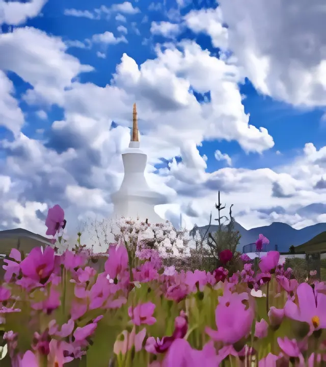 【尊勝白塔】該塔林又稱「勝利塔」、「尊勝塔林」,是以藏族同胞心中至高無上的白塔為主題, 它純四方形的底座,分為五層,最高層中央為一個高大的白塔,周圍排列四層小白塔,從上 到下每層依次有15、23、31、39座塔,共108座小白塔,小白塔圍繞著大白塔,頗為壯觀。 每天都有人來轉經。尊勝塔林的108個小塔內放置的是釋迦牟尼佛祖,主塔內放置的是尊勝 佛母。尊勝佛母,音:「朗覺瑪」,乃長壽三尊之一,主長壽。