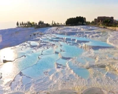 1985 年列入世界自然文化遺產;Pamukkale此一土耳其語的字面意義就是「棉花的城堡」。自破碎帶 湧出的碳酸氫鈣泉,夾帶大量石灰石滲出物,流經地表後冷卻沈澱,凝固成石灰華,順著地形不斷堆積 的結果,形成有如棉花般潔白的團狀塊體。