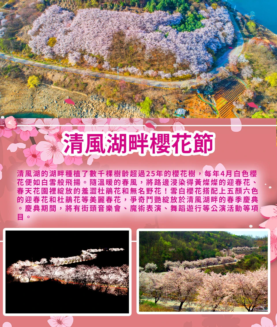 【清風湖畔櫻花節(賞櫻)】清風湖的湖畔種植了數千棵樹齡超過25年的櫻花樹,每年4月白色櫻花便如白雪般飛揚。隨溫暖的春風,將路邊浸染得黃燦燦的迎春花、春天花園裡綻放的羞澀杜鵑花和無名野花!雪白櫻花搭配上五顏六色的迎春花和杜鵑花等美麗春花,爭奇鬥艷綻放於清風湖畔的春季慶典。慶典期間,將有街頭音樂會、魔術表演、舞蹈遊行等公演活動等項目。