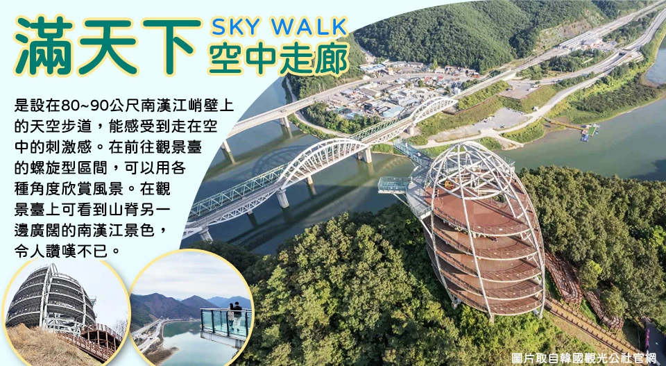 【韓國100選~滿天下空中走廊SKY WALK】是設在80~ 90公尺 南漢江峭壁上的天空步道,能感受到走在空中的刺激感。在前往觀景臺的螺旋型區間,可以用各種角度欣賞風景。在觀景臺上可看到山脊另一邊廣闊的南漢江景色,令人讚嘆不已。