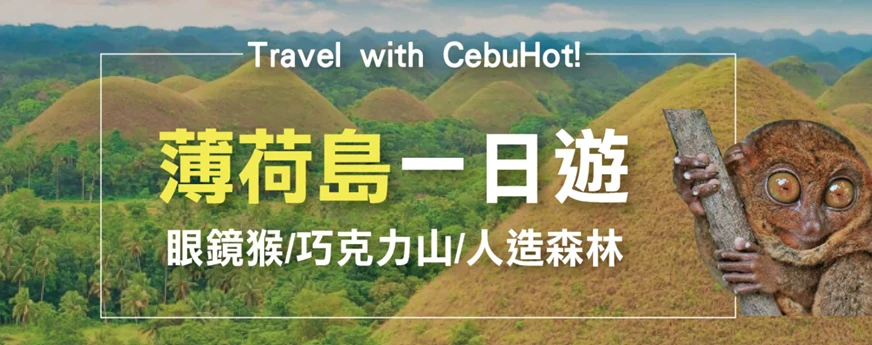 【薄荷島】抵達薄荷 島後. 前往三百年以上歷史最【巴卡隆教堂】結合了羅馬天主教的建築特色,帶出一種新羅馬寺廟 的風格,讓信徒隨時與天主溝通。教堂內大量古代文獻保存良好。【歃血盟約紀念碑】這裡有記載 了當地的祖先箄簬籃屢的歷史與艱辛的故事。立即安排搭乘【漂流竹筏船屋】遊覽兩岸翠綠之風 景,乘著船屋,一邊品嚐菲式午餐和享受徐徐清風、綠水及欣賞兩岸原始叢林,河岸旁有當地原住 民表演民族舞蹈及歌唱,您也可以參與其中。餐後參觀全世界最小的猴子【眼鏡猴Tarsius Monkey】眼鏡猴最大的特色為頭部可180度轉動,身體小小的但眼睛卻又大又圓,身上的毛如絨 絲,又軟又厚,十分逗趣也十分討人歡喜。隨後驅車前往巧克力山丘參觀,途經薄荷島上唯一的原 始叢林區;【巧克力山Chocolate Hill】是由1268個大小山丘所組成的,每一座高度為40~120 公尺,都是圓錐體,地質屬石灰岩地型,從登高處望下,會因時節不同而多有變化,時而翠綠,時 而火紅,又時而昏暗,會讓您嘆為觀止,目前為世界十大奇景之一,續參觀頂峰處的【比翼雙飛觀 景坪】。隨即返回宿霧。