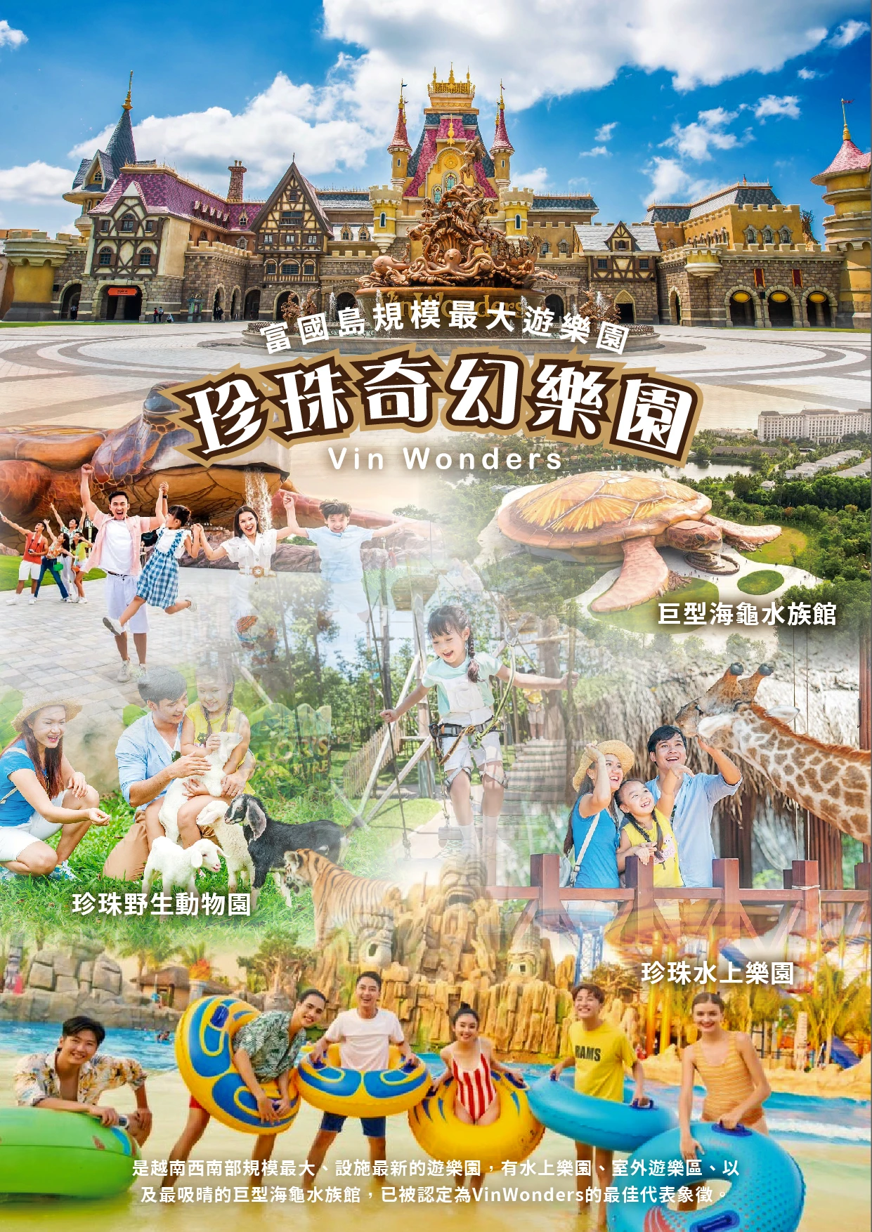 【VinWonder 珍珠奇幻樂園】於2014年11月開幕,佔地面積50 萬公頃,是越南西南部規模最大、設 施最新的遊樂園,有水上樂園、室外遊樂區、以及最吸晴的巨型海龜水族館,已被認定為VinWonders 的最佳代表象徵。來到這個充滿活力的娛樂天堂,你可以在清涼的水中盡情玩耍,或是搭乘著刺激又冒 險的遊樂設施,讓你無時無刻都歡樂開懷。主題樂園有6個分區,代表6個地區,12個獨特的主題,靈感 來自人類著名的文明、童話故事和世界軼事。所有這些都有望為所有遊客帶來神奇、新穎和迷人的體驗。 將讓您變身為勇士,發現許多世界奇觀,克服挑戰並與您心愛的人一起捕捉難忘的時刻。
