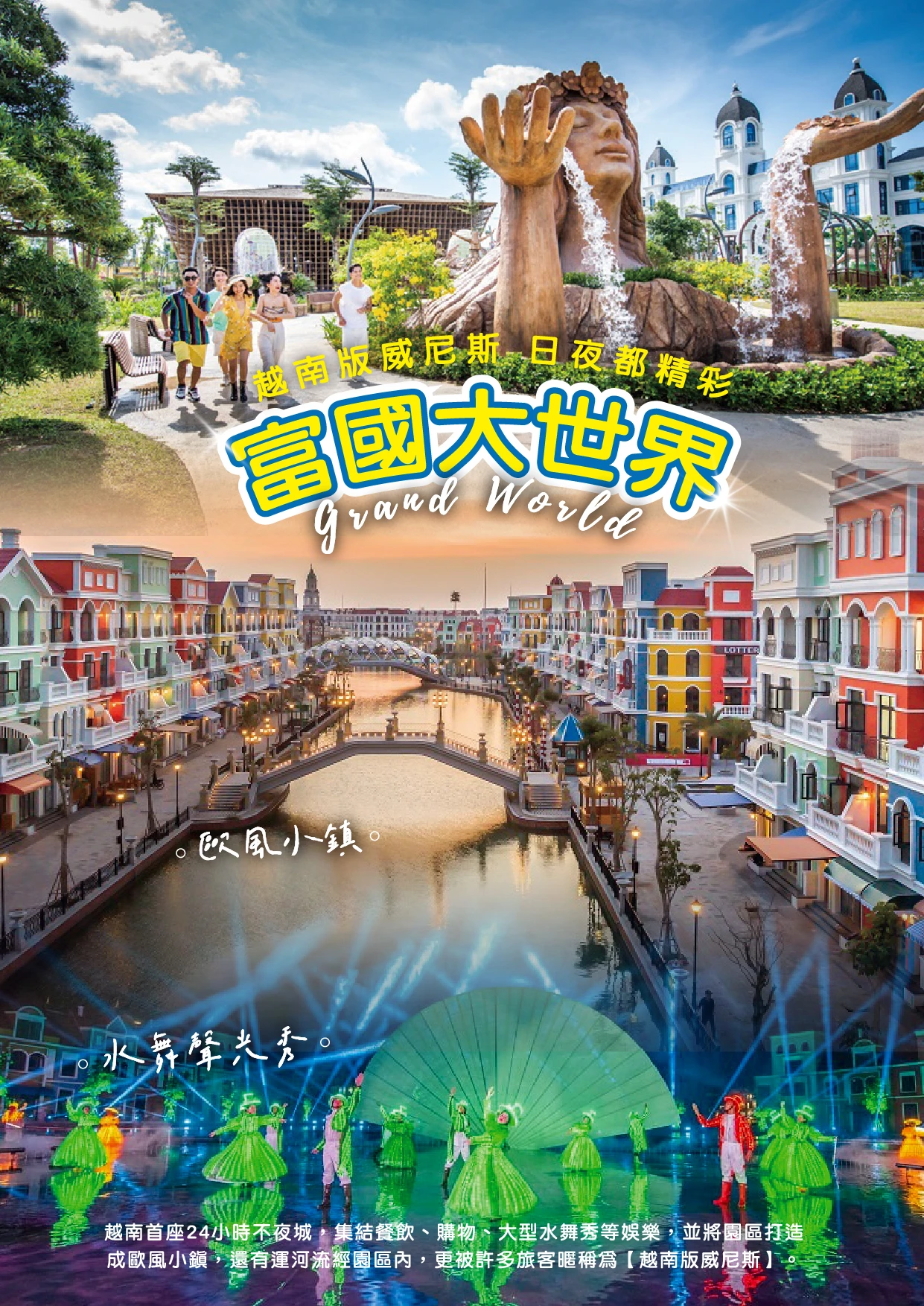 【Grand World 富國大世界】由越南最大Vingroup 集團打造,佔地廣達85 公頃,2022 年4月全新 開幕的「富國島Grand World」(富國大世界),就是越南首座24 小時不夜城,集結餐飲、購物、大 型水舞秀等娛樂,並將園區打造成歐風小鎮,還有運河流經園區內,更被許多旅客暱稱為「越南版威尼 斯」。來到富國大世界夜市裡,悠閒漫步在上海魔幻風情的燈籠街,也可以在擁有地中海風格酒吧和酒 館盡情歡樂!在充滿義式夢想的威尼斯運河上,沿著貢多拉河航行。沉浸在色彩繽紛的藝術空間世界 裡,來自世界各國遊客可以在此盡情的欣賞愛情舞蹈劇「威尼斯的顏色」